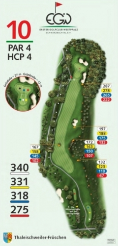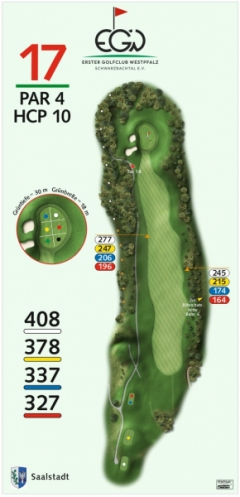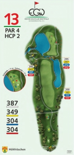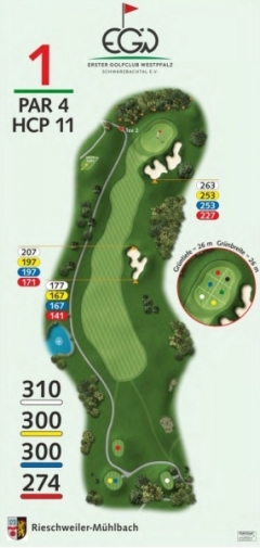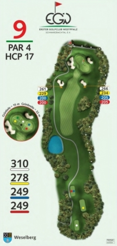Par 4, Hcp 17, 310 m (weiß), 278 m (gelb), 249 m (blau), 249 m (rot)