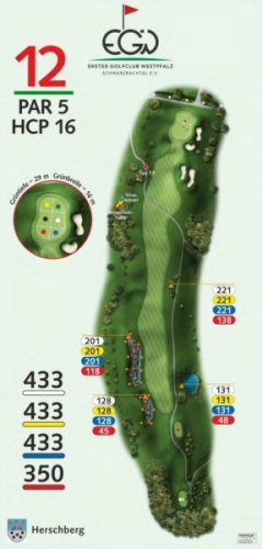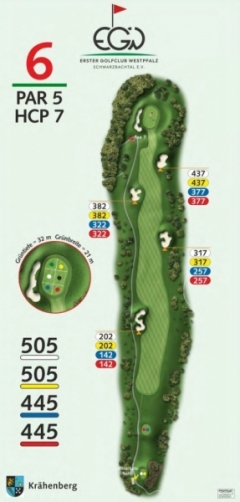 Par 5, Hcp 7, 505 m (weiß), 505 m (gelb), 445 m (blau), 445 m (rot)