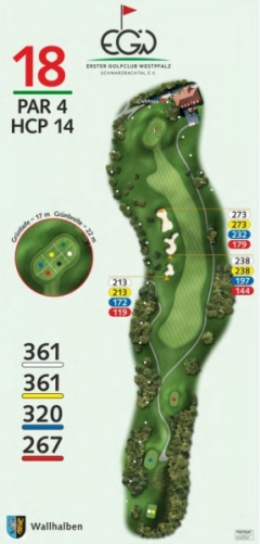 Par 4, Hcp 14, 361 m (weiß), 361 m (gelb), 320 m (blau), 267 m (rot)