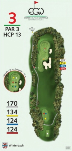 Par 3, Hcp 13, 170 m (weiß), 134 m (gelb), 124 m (blau), 124 m (rot)