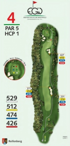 Par 5, Hcp 1, 529 m (weiß), 512 m (gelb), 474 m (blau), 426 m (rot)