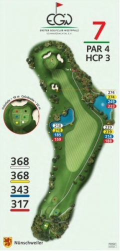Par 4, Hcp 3, 368 m (weiß), 368 m (gelb), 343 m (blau), 317 m (rot)