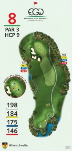 Par 3, Hcp 9, 198 (weiß), 184 m (gelb), 175 m (blau), 146 m (rot)